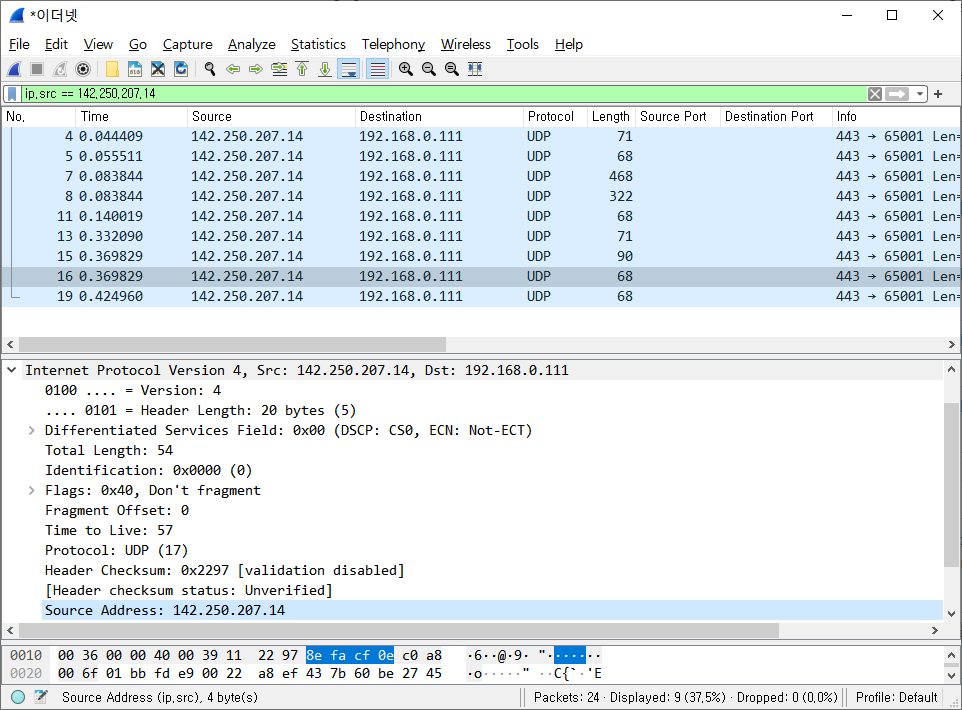 3. 아래 그림과 같이 자동으로 Source IP filter가 적용 되었습니다. 이를 통해 Source IP filter를 어떻게 사용하는 지 알게 되었고 다른식으로 적용도 가능합니다. IP뿐만 아니라 TCP층 Application층 어디든 동일 방식으로 필터를 적용할 수 있습니다.