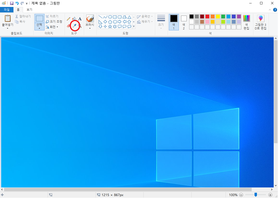 2. 그림판 화면에서 찾고 싶은 색이 있는 부분을 클릭하면 아래와 같이 색1의 색상이 동일 색상으로 변경됩니다.