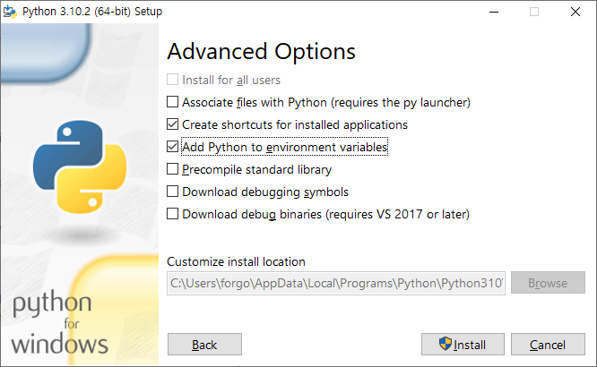 3. 아래와 같이 Python을 환경 변수(environment variables)에 추가 합니다. 그리고 다시 Install을 누릅니다.