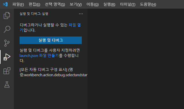 4. 위 과정으로도 pip 실행이 안된다면 아래 그림과 같이 디버그에서 "실행 및 디버그"를 클릭하고 창에 파이썬(Python)이 뜨면 파이썬을 선택 한다.