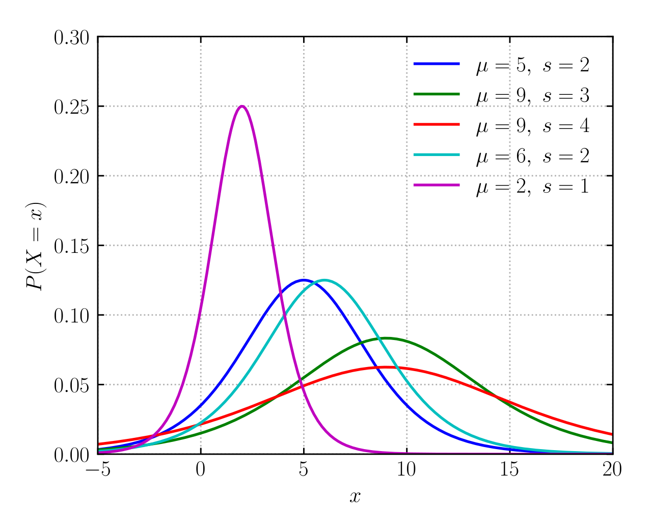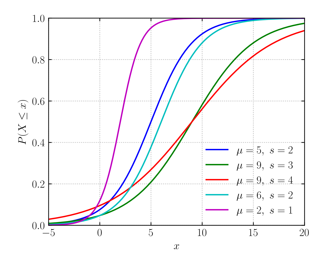 이러한 현상을 표현 한 것이 두번째 그림입니다. u는 location 파라미터이고 확률 밀도에서 평균에 상응하는 값입니다. s는 scale로 표준편차(Standard deviation)에 사응하는 결과 입니다.