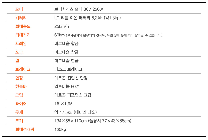 속도는 25Km/h까지 가능하고 충전 시 최대 60Km까지 이동 가능(사용자 무게, 경사에 따라 변동됨) 합니다. 배터리를 제외한 자전거 무게는 약 17.5kg이고 배터리는 1.3kg이므로 약 19kg 정도로 생각하시면 됩니다.