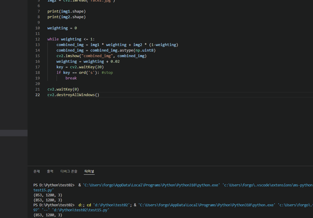 13번 라인: 두개의 이미지에 가중치를 주면서 합칩니다.