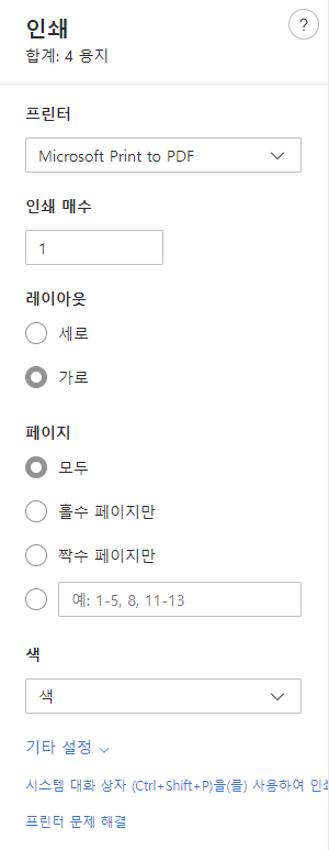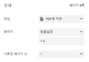 프린터를 클릭 후 인쇄 대상을 "PDF로 저장"으로 변경합니다.