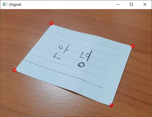 아래 코드는 종이의 끝점을 마우스(Mouse) 왼쪽 클릭 하면 빨간색 원이 생기고 해당 좌표 값은 리스트에 기록됩니다. 4개의 포인트를 기록하고 5번 마우스를 클릭하거나 마우스 오른쪽 클릭하면 기존의 빨간색 원이 사라지고 리셋됩니다.