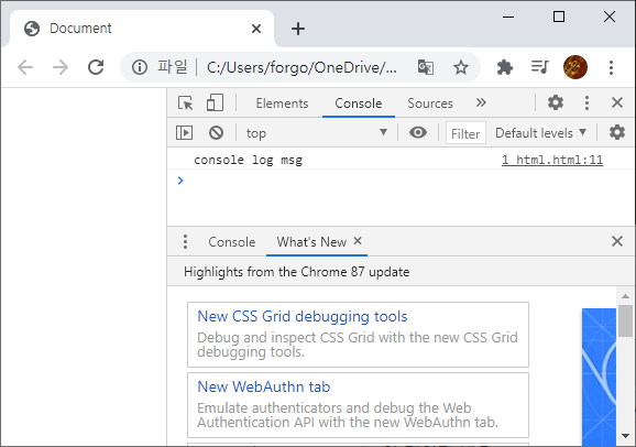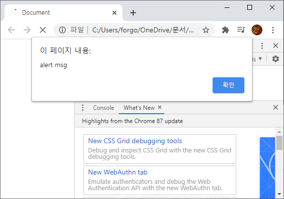 html 파일을 열면 위처럼 alert 메세지가 바로 뜨고 console log는 크롬에서 개발자 모드로 들어가면 위 그림처럼 console 탭이 있다.