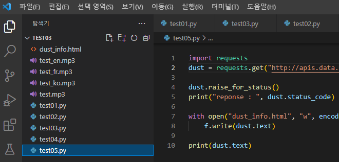 7~8번 라인: API 주소를 통해 읽은 값을 dust_info.html 이라는 파일명으로 파이썬 코드를 작성하고 있는 폴더에 저장해줍니다.