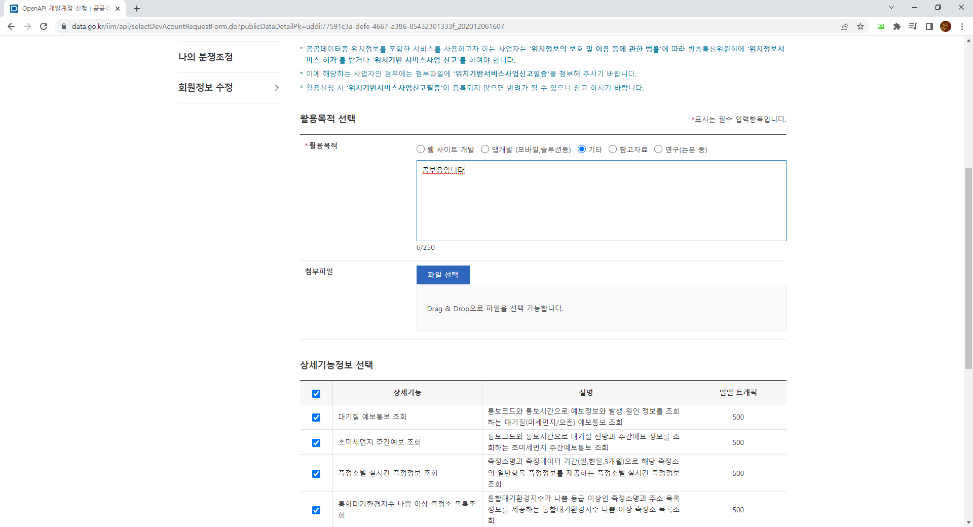 2. 오픈 API 항목에서 "한국환경공간_에어코리아_대기오염정보"에서 "활용신청" 버튼을 클릭합니다.