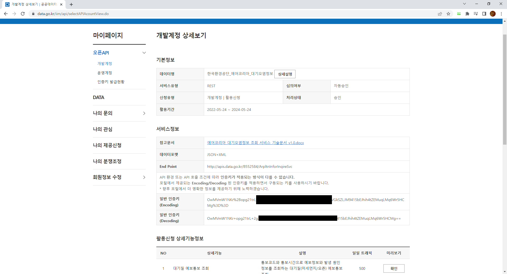 4. 신청 완료 후 아래와 같이 인증키를 확인할 수 있습니다. 아래 인증키로 API를 사용할 수 있게 된 것입니다.