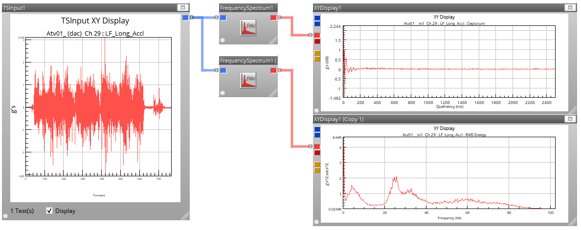 전체 구조는 위와 같습니다. 왼쪽에 윈도우창은 시간 도메인에서 측정한 가속도(Acceleration) 값 입니다. 가운데 2개의 창은 주파수 변환 박스로 생각하시면 됩니다. 그리고 오른쪽 두개 윈도우는 주파수 변환을 거쳐서 나온 출력 화면 입니다.