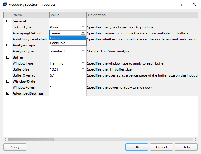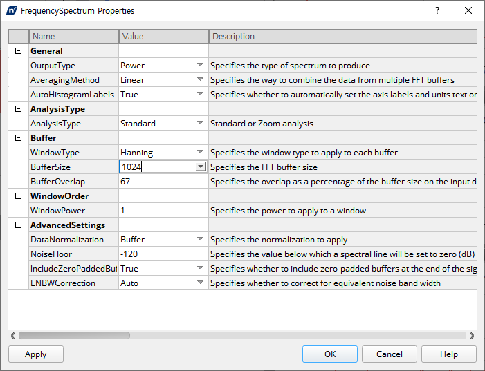앞서 FFT는 시간 도메인으로 측정한 가속도 값을 작은 버퍼로 나누고 각 버퍼를 FFT로 변환해서 평균을 낸다고 했습니다. 버퍼는 FFT를 만들기 위해 필요 합니다. 여기서 Buffer Size를 결정해야 하는데 아래 그림과 같이 32~1048576 크기까지 다양하게 선택 할 수 있습니다.