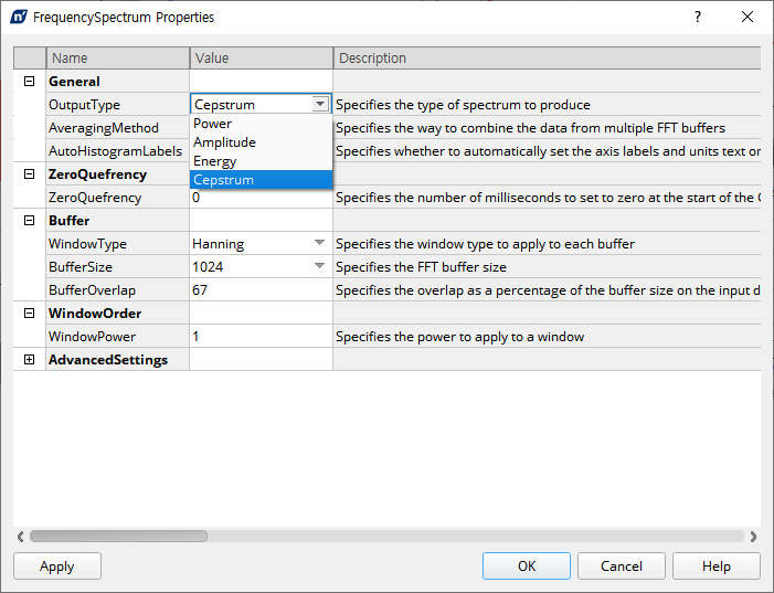 FFT 출력 방식은 위 그림과 같이 Power, Amplitude, Energy, Cepstrum 방식이 있습니다.