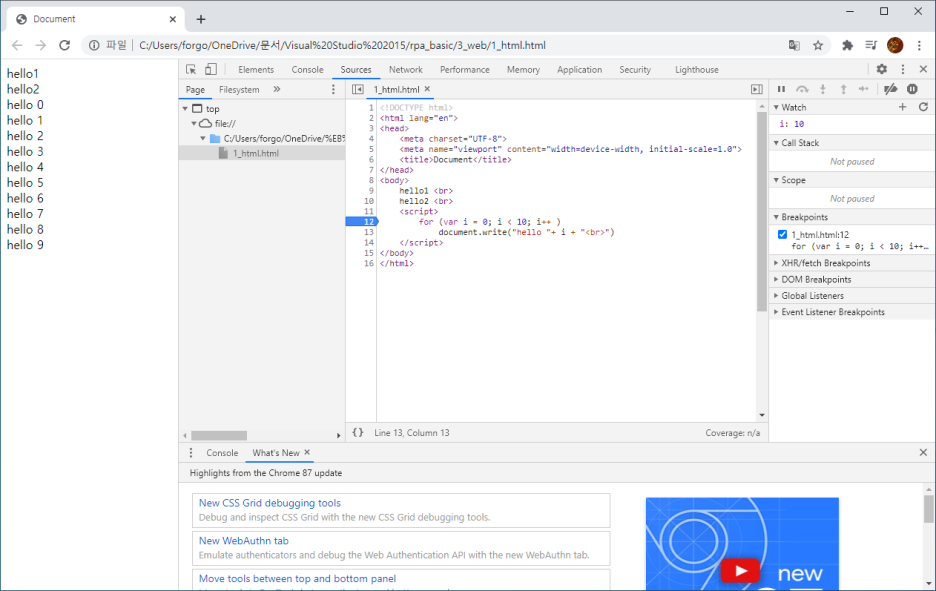 여기 예제에서는 12번을 선택하겠다. 그리고 추적해서 보고 싶은 변수명을 Watch 항목에 입력한다. 그리고 Watch 위에 화살표로 한줄 씩 이동시키면서 변수의 변화를 확인할 수 있다.