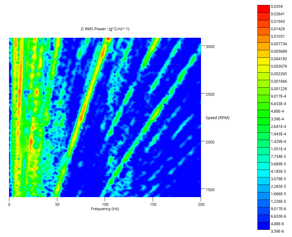 위 그림은 waterfall 그래프로 주파수와 속도(Speed) 값을 X, Y축으로 하고 Power 값을 측정한 그래프입니다. 대각선으로 선이 따라 움직이는 데 이 부분이 Order 라인입니다. 회전체의 특성 상 Order 라인을 따라 특성을 보입니다.