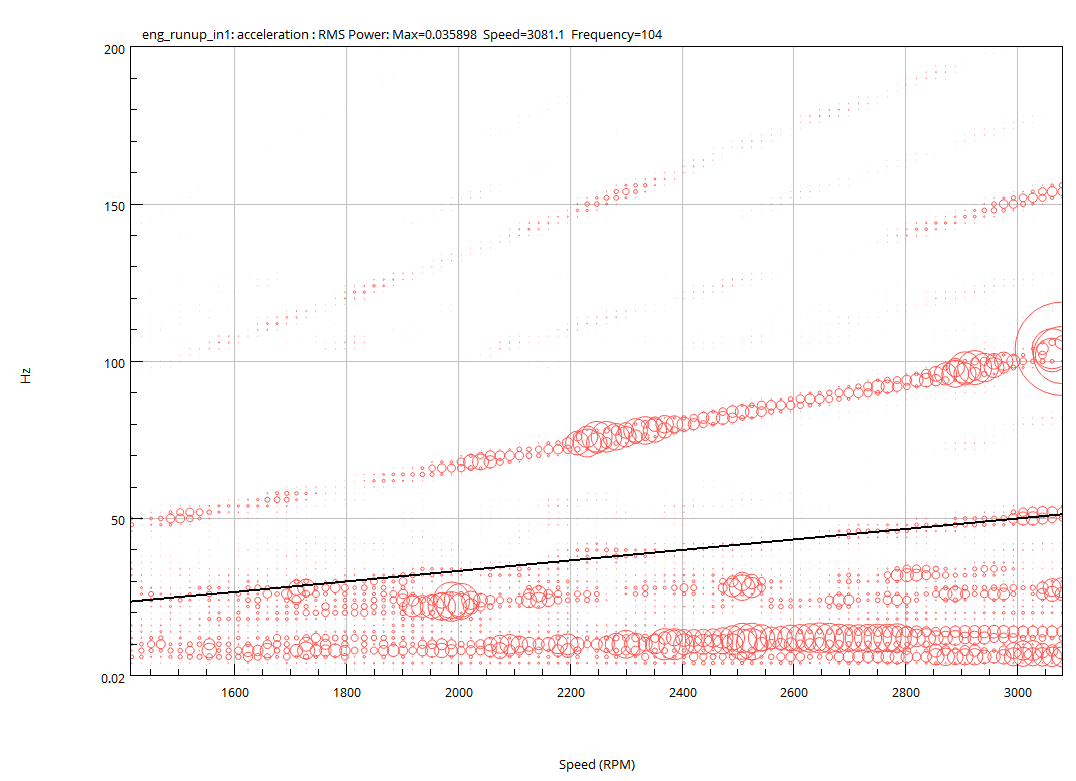 위 그림은 Campbell plot으로 주파수와 속도로 그래프를 표현하고 Z축에 해당하는 파워 값은 원의 크기로 표현해줍니다. 위에서 검은색 라인은 첫번째 Order를 라인으로 그린 것입니다. 그림에서 1st order 이하의 order에서 진동 값들이 크게 발생함을 알 수 있습니다.