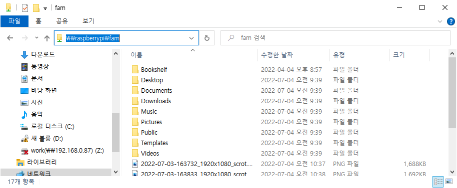 1. 폴더 주소에 아래와 같이 \\raspberrypi\fam 을 입력합니다. 제 ID는 fam이지만 본인의 id 값을 입력하셔야 합니다.