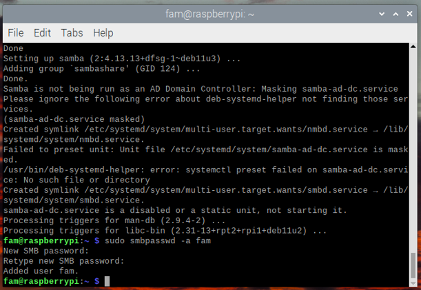 sudo smbpasswd -a fam