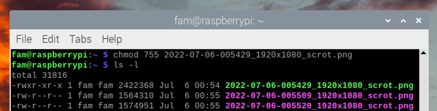 앞서 10진수와 2진수로 권한에 대해 설명하였습니다. 아래 예제를 보시면 쉽게 변경하는 방법에 대해 알 수 있습니다. 아래 예제는 755 로 파일의 권한을 변경합니다. 755는 소유자는 7(읽기, 쓰기, 실행)권한을 다 가지고 그룹과 기타는 5(읽기, 실행)에 대해 권한을 가집니다.
