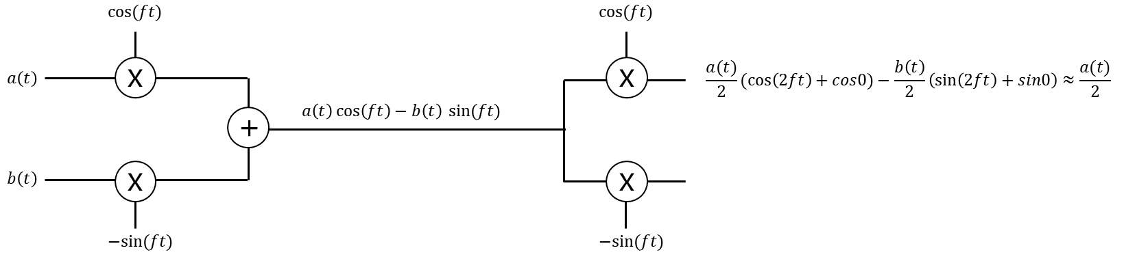 위 그림과 같이 삼각함수를 사용해서 복호화 하는 과정은 복잡합니다. cos2ft와 sin2ft는 고주파 신호로 LPF(Low Pass Filter)를 사용해서 필터링 처리 합니다. 최종 신호를 2배 하면 원 신호를 복구 할 수 있습니다.