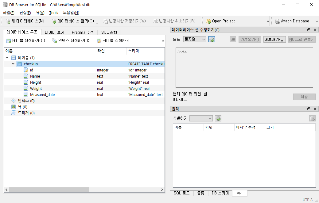 DB를 생성하였으니 DB안에 테이블을 만들어서 사용해보겠습니다. 참고로 SQLite를 윈도우 화면에서 쉽게 GUI로 볼 수 있는 무료 프로그램을 https://github.com/sqlitebrowser/sqlitebrowser/releases/tag/v3.11.0-beta3 에서 다운 받을 수 있습니다.