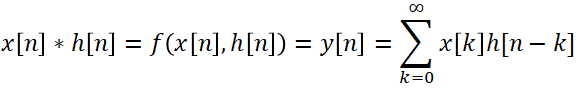 수식은 이산 영역에서 위와 같이 표현 됩니다. Convolution에 대한 표기는 별표(*)를 사용하고 출력 값은 입력 값과 Impulse 응답의 누적합으로 표현 됩니다.