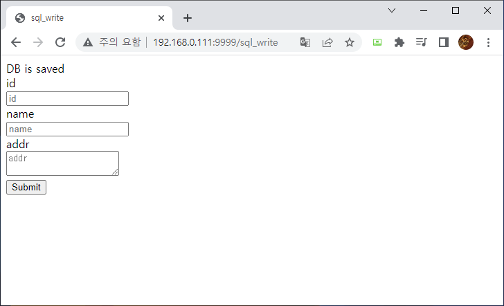 id는 10로 name은 Harry로 addr는 Texas로 입력하고 submit 버튼을 눌러 줍니다.