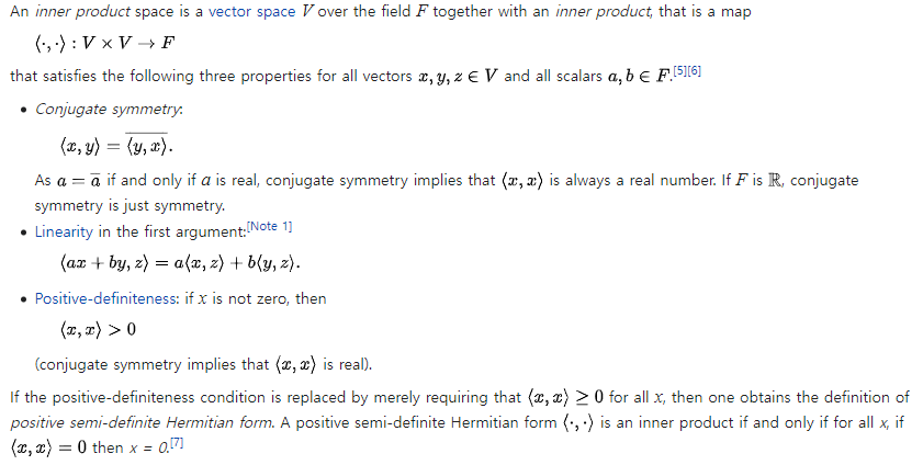 내적 공간이란 내적(Inner Product)을 만족하는 벡터 공간(Vector Space)를 의미 합니다. 내적에 대해서는 https://scribblinganything.tistory.com/622 링크를 참조 하시면 됩니다. 벡터 공간이란 앞서 벡터 값이 들어가 있는 닫힌 공간(Cloased set)을 의미 합니다.