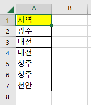 위와 같이 엑셀 파일에 지역명이 텍스트로 적혀있는데 동일 지역명을 검출하고 각 지역명이 몇개로 구성되었는지를 확인하는 것이었습니다. 위는 간략한 예제이고 실제 값은 몇 천개 정도 있었습니다.