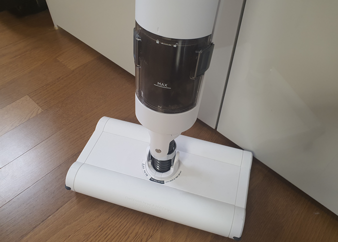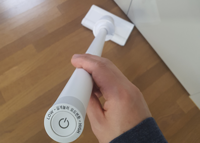사진처럼 청소기 봉의 끝단에 전원 버튼이 있어 간단하게 버튼을 눌러서 동작할 수 있습니다. 모드 선택도 단순히 길게 눌러서 변경이 가능합니다. 저와 같이 기능이 너무 많아 복잡한거 싫어하는 사람에게는 최적입니다.