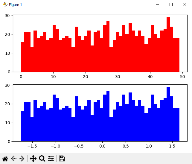 그리고 각 화면에 들어갈 그래프를 히스토그램(histogram)으로 설정 후 스케일링 전에 데이터는 빨간색으로 후의 데이터는 파란색으로 표기 해줍니다.