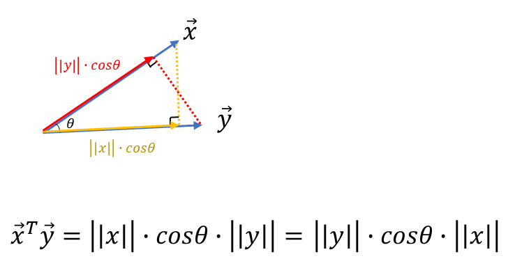 즉 내적의 수식을 통해 의미를 살펴 보면 x벡터를 y벡터에 정사영을 내린 값과 y벡터를 값한 값이다. 정사영을 내렸다는 의미는 Projection라는 말로 "투사"하였다는 의미로 x를 y에 투사한 값과 y 값을 곱한 값으로 x와 y가 서로 얼마나 관계되어 있는지를 알 수 있습니다.