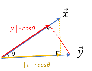 수식2는 수식3으로 설명이 됩니다. x크기에 cosΘ를 곱한 것은 위 그림에서 노란선의 점선과 마주치는 곳까지의 y벡터 값이 됩니다.