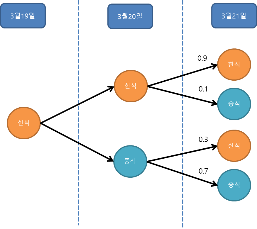 예를 들어 위 그림1과 같이 음식을 먹을 확률이 정해져 있을 경우 현재 상황이 3월 20일인 상태(State)로 가정하고 20일에 한식을 먹고 3월 21일에 한식을 먹을 확률을 행렬로 표현하면 아래와 같습니다.