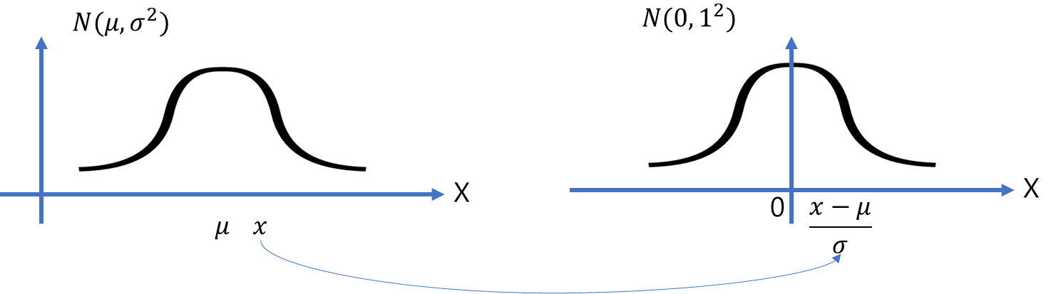 표준화란 간단하게 말하면 기준이 되는 길이에 맞춰 모든 값들을 비율을 조정하는 것입니다. 표준 정규분포가 나온 이유는 그림1과 같이 다양한 평균과 분산의 정규분포를 평균0, 분산1로 바꾸는 작업입니다. 이렇게 하면 다양한 정규분포를 동일 선상에서 쉽게 확률 값을 비교할 수 있습니다.