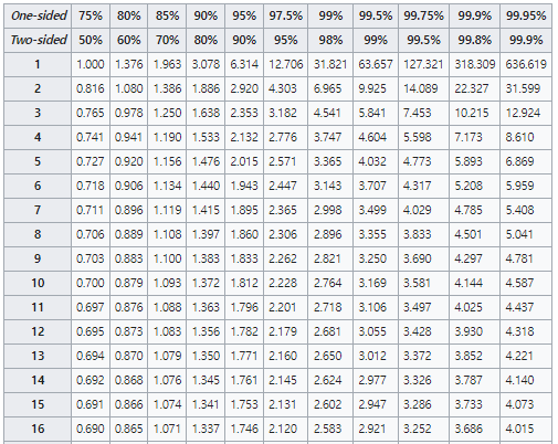 테이블의 일부 값만을 가져 왔습니다. 모든 테이블을 보시려면 위키피디아를 참조 하십시오 행(row) 값이 자유도 입니다.