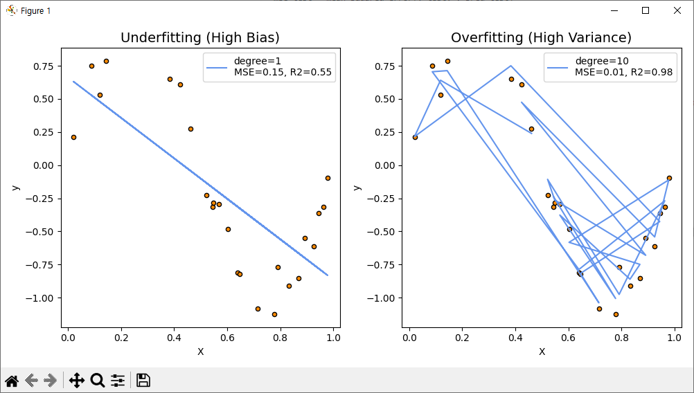 앞서 그림1과 같이 Underfitting에서 MSE 에러 값이 높게 나옵니다. Overfitting은 그래도 에러 값은 작게 나오고 R제곱(https://scribblinganything.tistory.com/693) 값은 1에 가깝게 나와서 괜찮은 모델링이라고 할 수 있습니다. 데이터가 더 복잡해질 경우 Overfitting이 안맞기 시작할 건데 이 경우는 그래도 잘맞게 나왔습니다.
