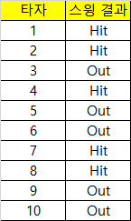 예를 들어, 야구 경기에서 타자가 스윙을 치는 경우, 그 결과는 안타(Hit)와 아웃(Out) 두 가지 중 하나가 될 수 있습니다. 타자의 스윙 결과를 예측하는 모델을 만들기 위해, 이전의 타자들의 기록을 수집한 데이터셋이 있다고 가정해봅시다. 이 데이터셋은 다음과 같습니다.