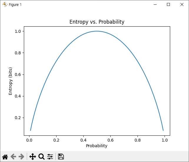 확률이 0이거나 1이 된다는 의미는 정보로서 의미가 없다는 뜻입니다. 그러므로 entropy가 0으로 나옵니다. 그리고 둘 중에 어떤 값이 나올지 모르는 0.5의 확률에서 엔트로피 값이 최대값 1이 나옵니다.