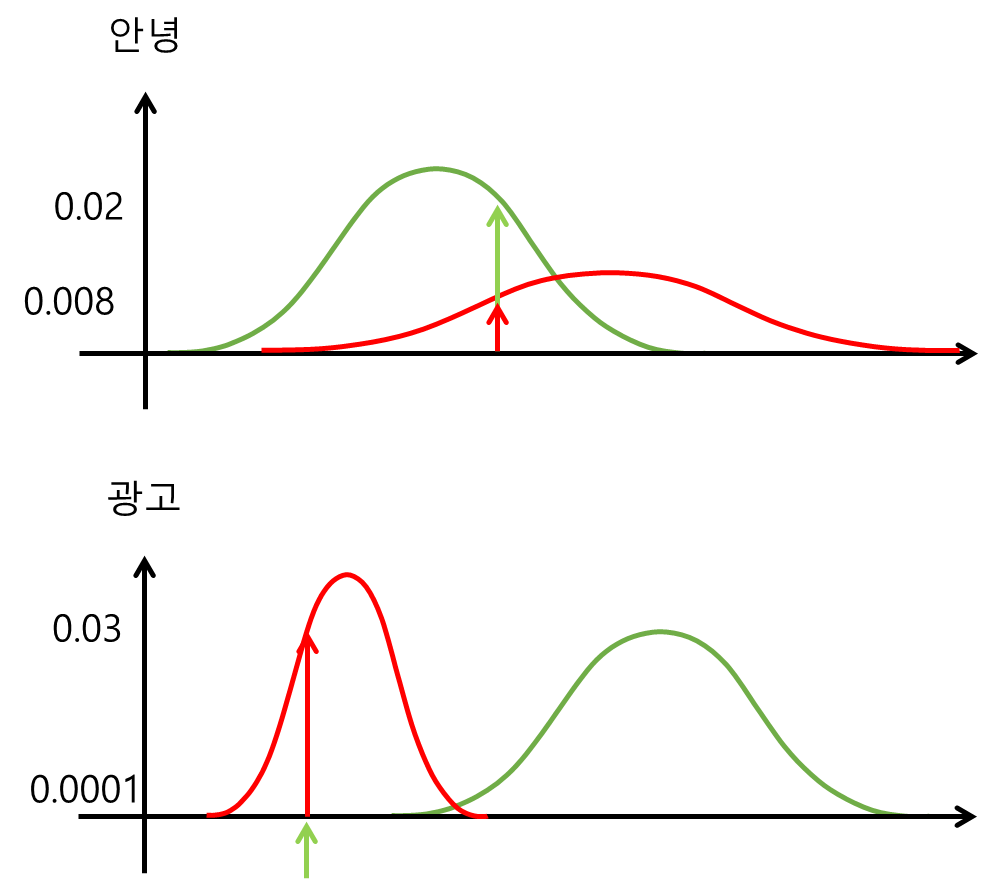 정상 메일과 스팸 메일에서 "안녕"이란 글과 "광고"라는 글의 개수를 평균과 분산을 구해서 가우시안 분포를 구했더니 아래와 같이 나왔습니다.
