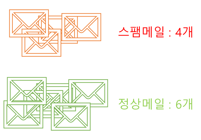 위 그림과 같이 스팸메일이 4개가 있고 정상 메일이 6개가 있습니다. 이 Training Data로 학습을 할 것입니다.
