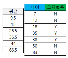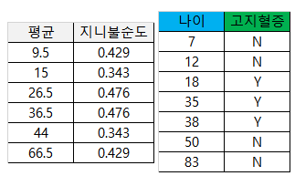 위와 같은 방식으로 나머지 나이 평균에 대한 지니 불순도를 구하면 아래와 같이 계산 됩니다.