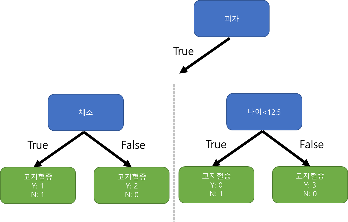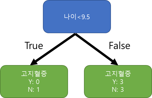 "나이<9.5"의 True 결과의 지니 불순도는 1-(0/1)^2 - (1/1)^2 = 0이 됩니다. 동일 방식으로 계산하면 False는 0.5가 됩니다.
