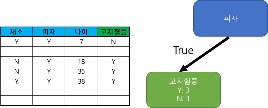 다음은 그림3과 같이 Root Node 다음 True에 해당하는 Internal Node를 찾아보겠습니다. 테이블의 값은 이제 4개가 남았고 여기에 대해 지니불순도를 구하면 됩니다.