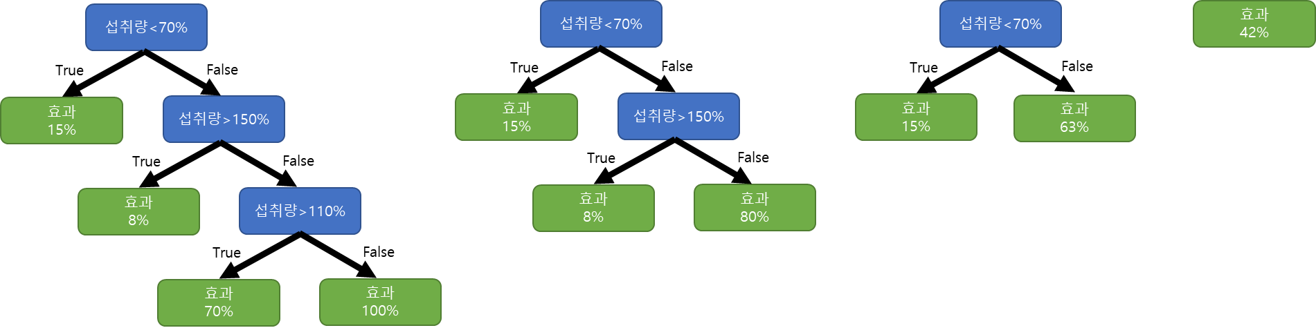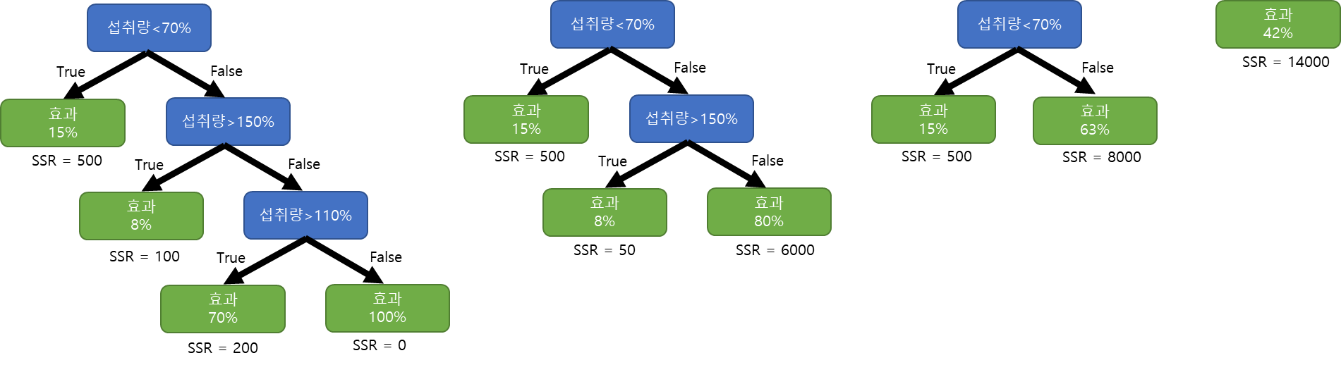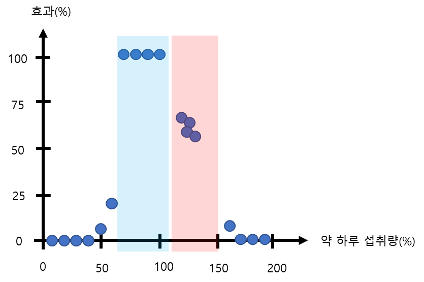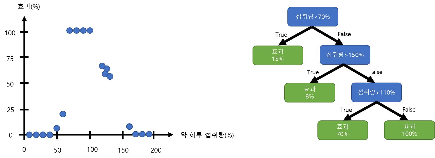 그림1과 같이 하루 약 섭취에 대한 효과의 데이터를 통해 회귀 트리(Regression Tree)를 오른쪽과 같이 만들 수 있습니다. 만드는 방법은 앞전 포스트를 참조하시면 됩니다.