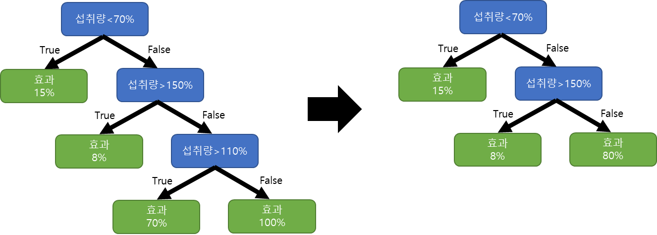 가지치키(Prunning)이란 그림과 같이 Internal Node와 Leaf Node의 묶음을 하나의 Leaf Node로 바꿔서 트리 모델을 심플하게 만드는 작업입니다.