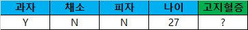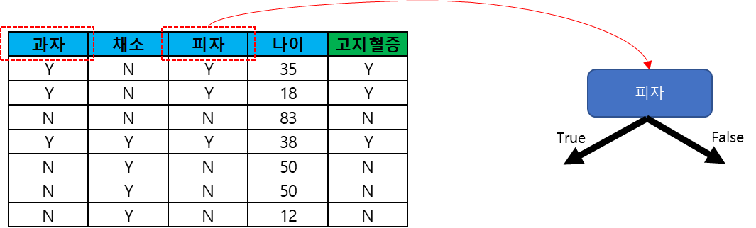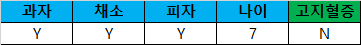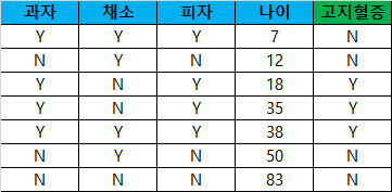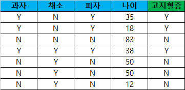 테이블1은 데이터셋으로 과자, 채소, 피자를 하루에 한번 먹으면 Yes, 아니면 No로 표기하였고 각 환자의 나이를 입력값으로 넣었습니다. 그리고 그에 따른 고지혈증을 가지고 있는지 여부에 대한 데이터 셋입니다.