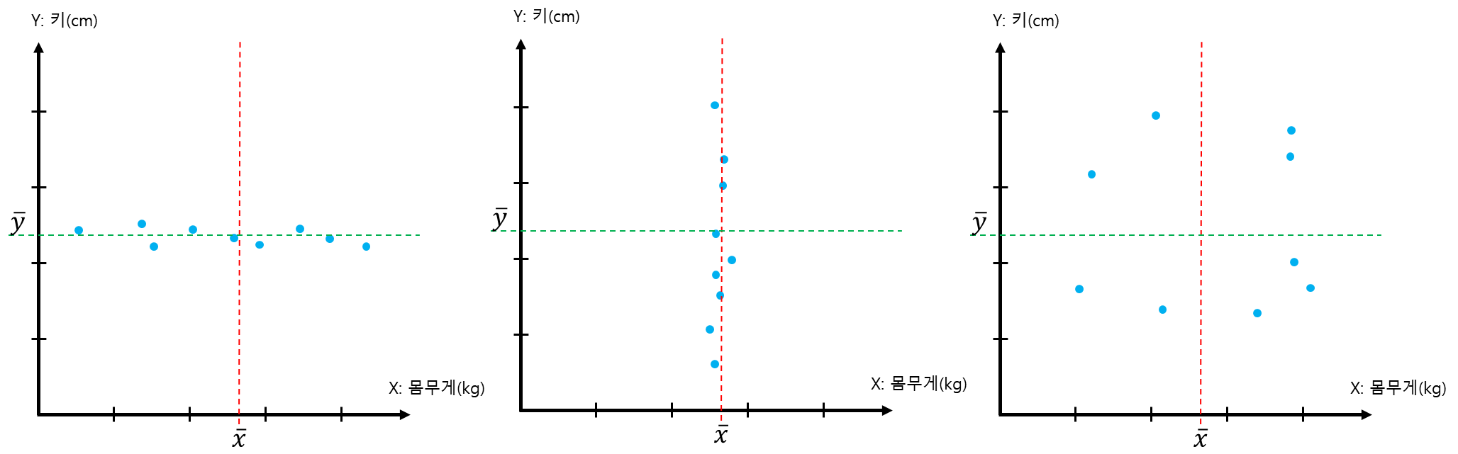 공분산은 수식1과 같이 표현하고 그림2와 같이 두 데이터 간의 관계를 설명합니다.