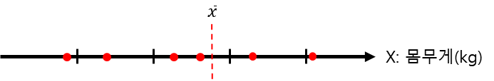 그림1과 같이 한반에 학생에 대한 몸무게에 대한 샘플 값들을 위와 같이 가져왔다고 가정하겠습니다. 이때 평균을 x에 바로 표기된 점이라고 하면 샘플의 분산(Variance)는 아래와 같이 구할 수 있습니다.