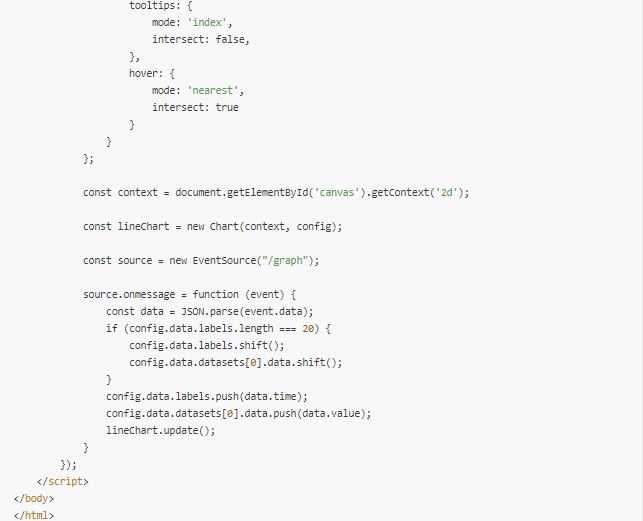 event가 발생은 1초에 한번씩 발생하도록 파이썬에서 설정해두었다. 그러면 1초에 한번씩 들어오는 JSON을 자바스크립트에서는 parse 명령을 통해 가져와서 이용하였다.