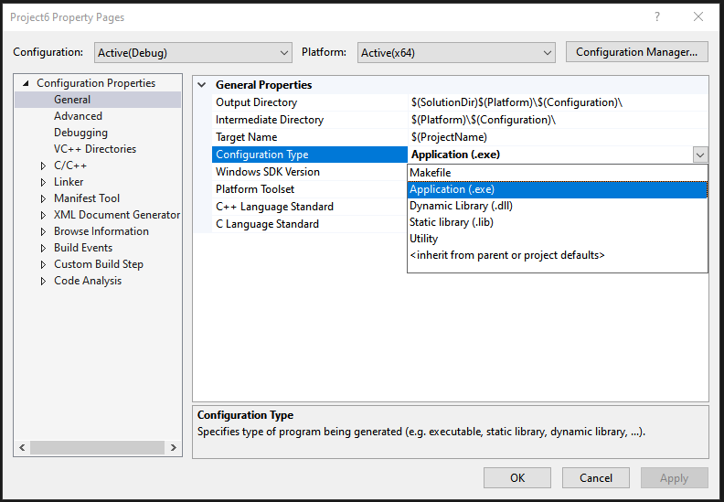 위 그림과 같이 프로젝트 설정에서 exe 파일이 아닌 dll과 lib 형태의 라이브러리를 만들어 줍니다. dll을 만들어 보겠습니다.